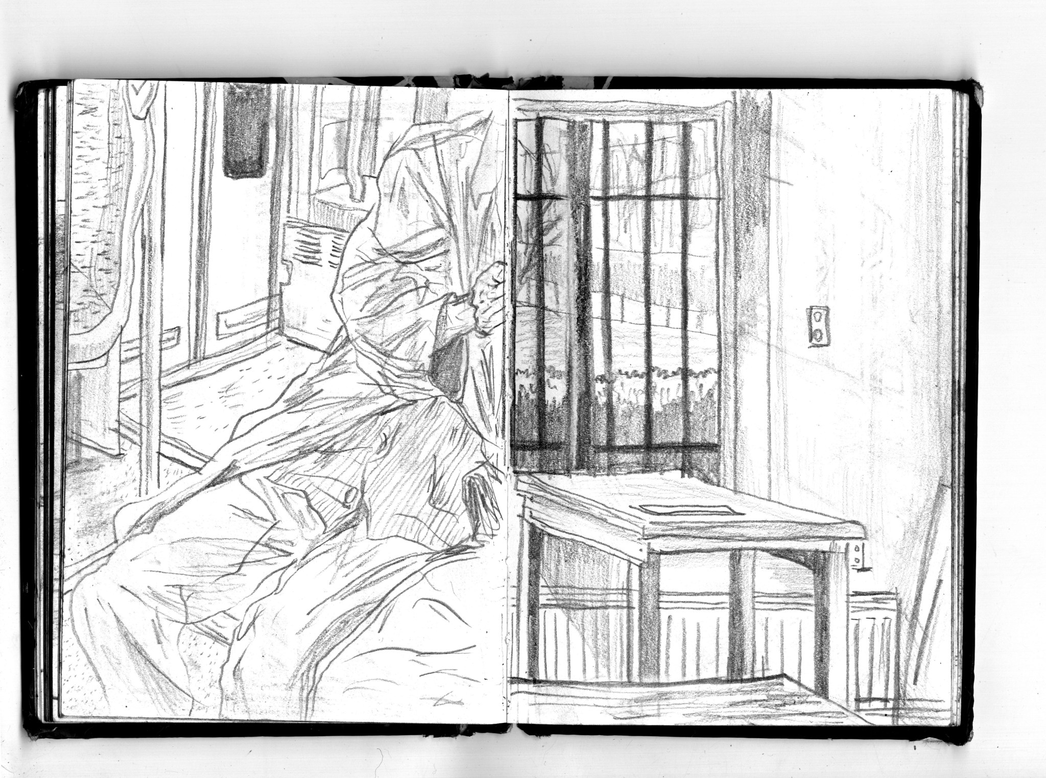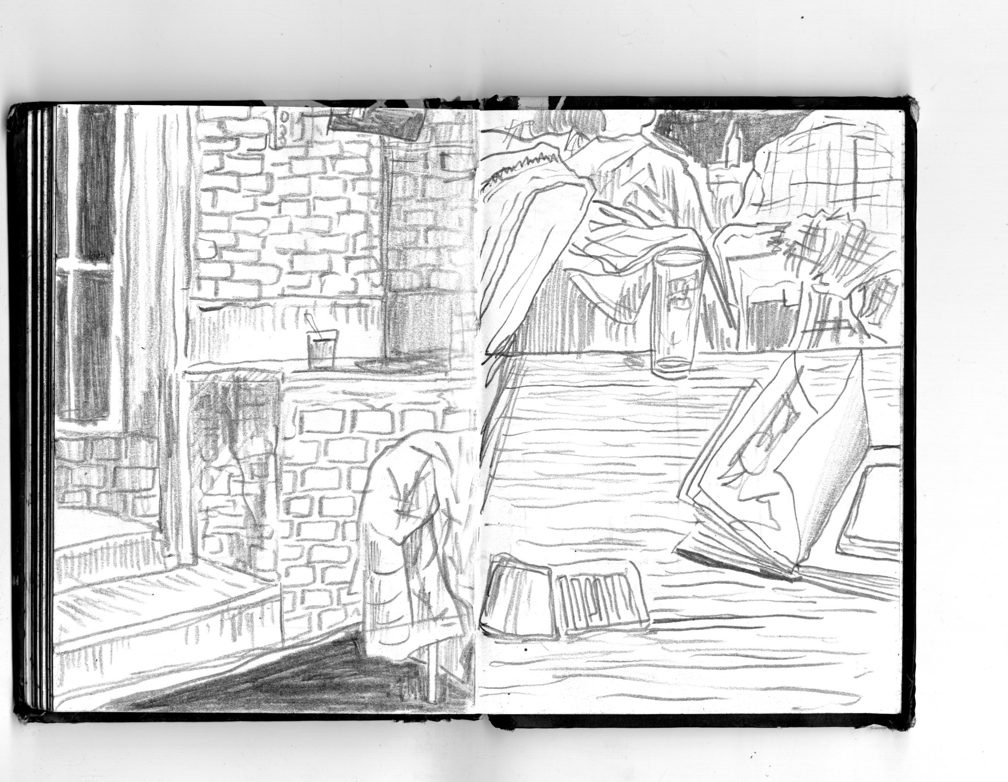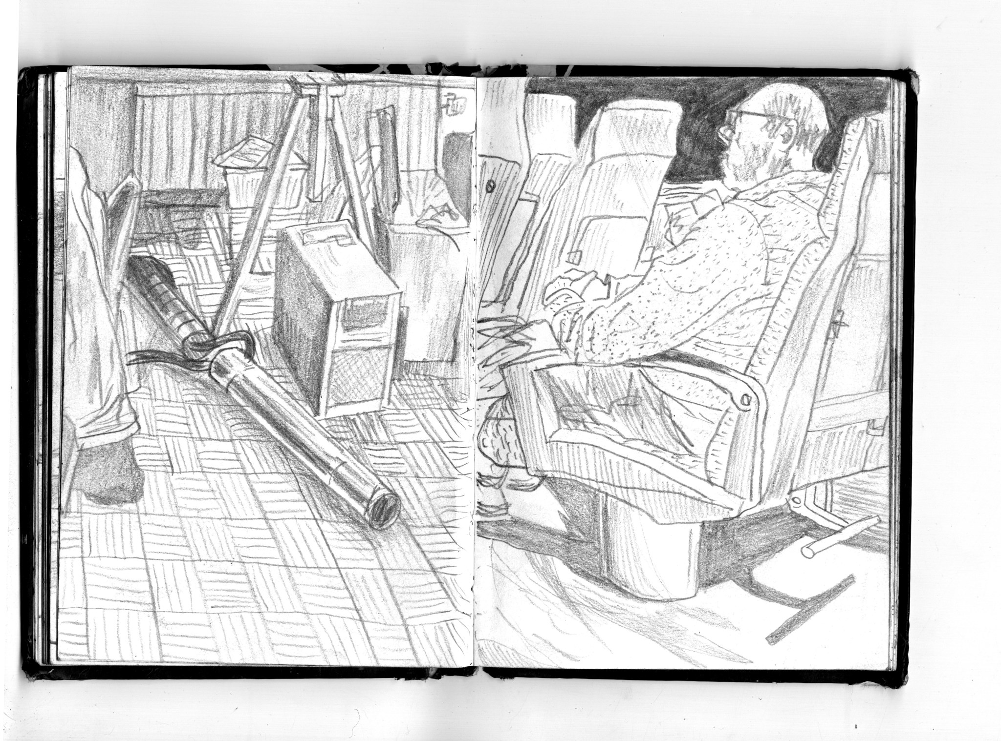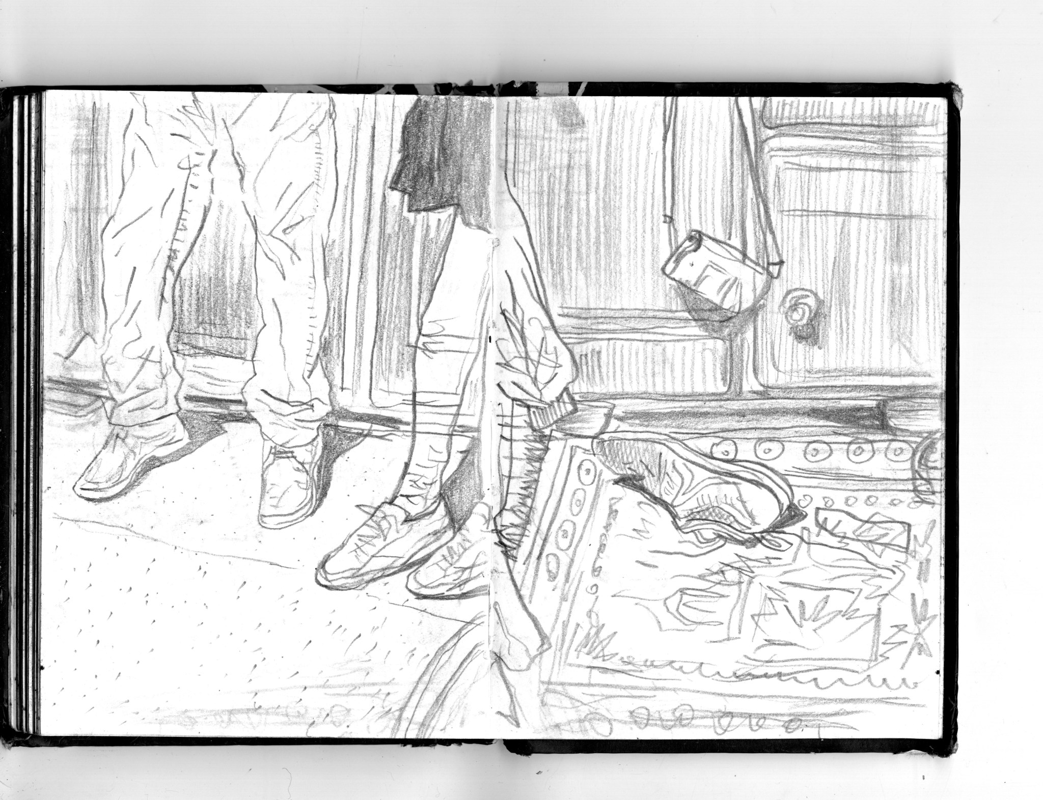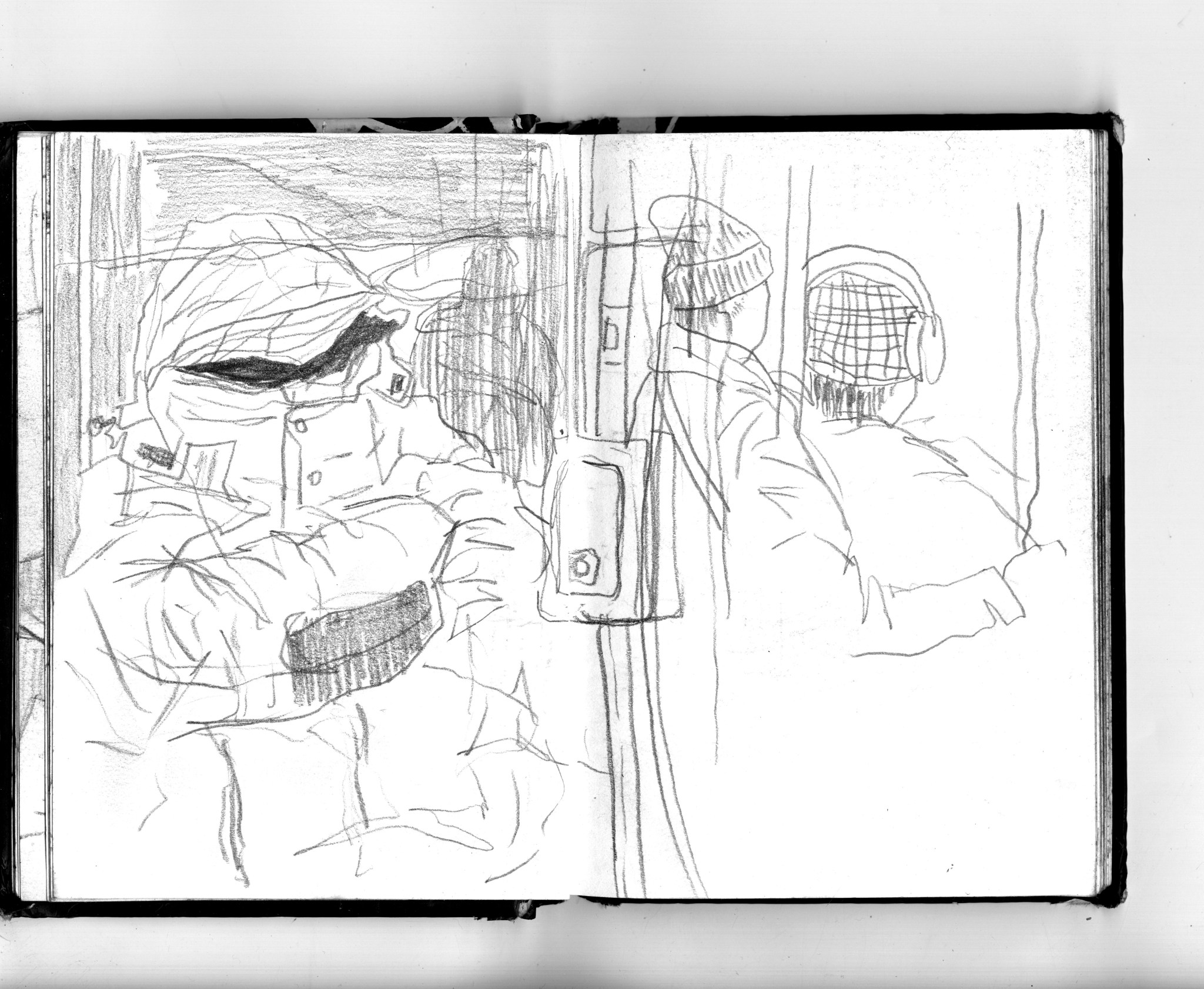 En janvier 2024 je décide de rendre viste à une amie à Londres. Alors que je suis arrivé depuis quelques heures, j’achète ce petit carnet A6 au Tate Modern Museum après avoir vu quelques expositions, dont une des peintures de Philipp Guston. Un soir j’ai manqué de peu de perdre ce carnet dans un bar de Piccadilly Circus. J’ai été le lendemain et heureusement, ils avaient bien gardé le carnet. Il m’avait fallu quand même un peu d’efforts pour retrouver l’enseigne du bar. Après ce week-end à Londres, j’ai décidé de pratiquer uniquement le dessin figuratif au crayon graphite jusqu’à remplir entièrement le carnet. De retour à Bruxelles je l’ai donc rempli pendant un mois à peu près partout où j’allais.