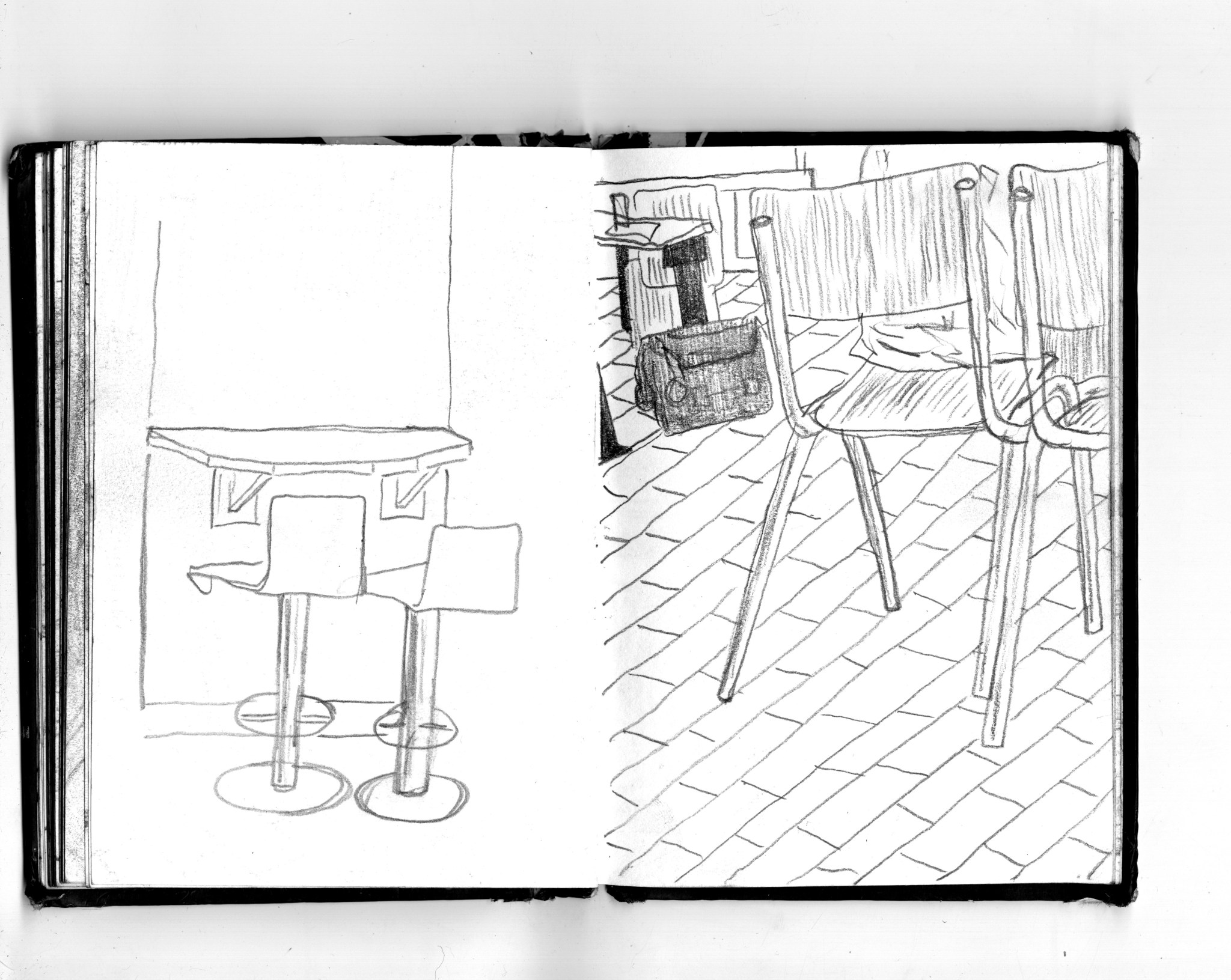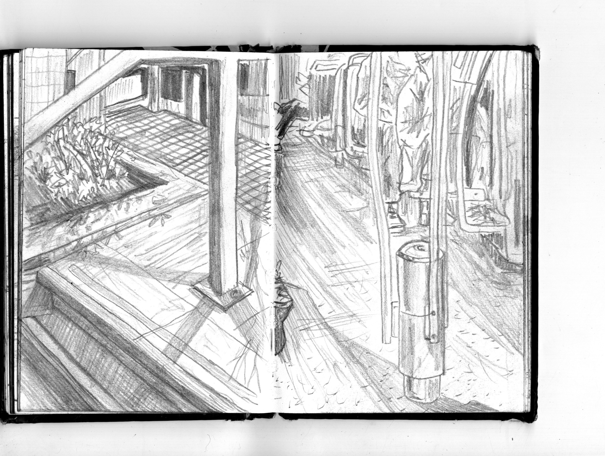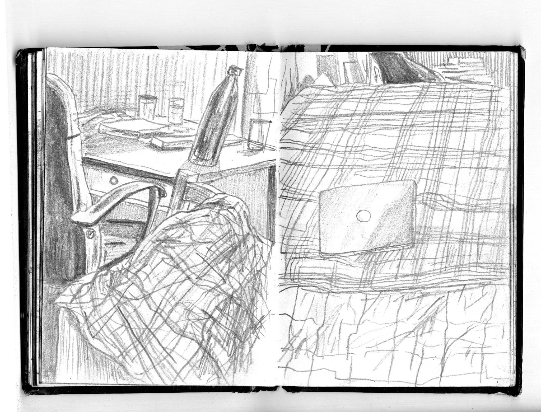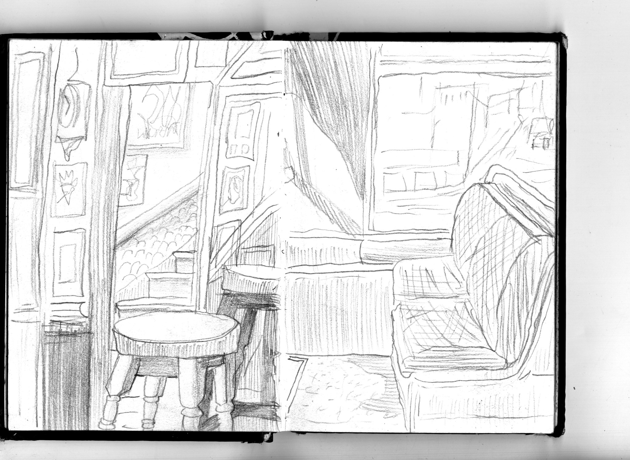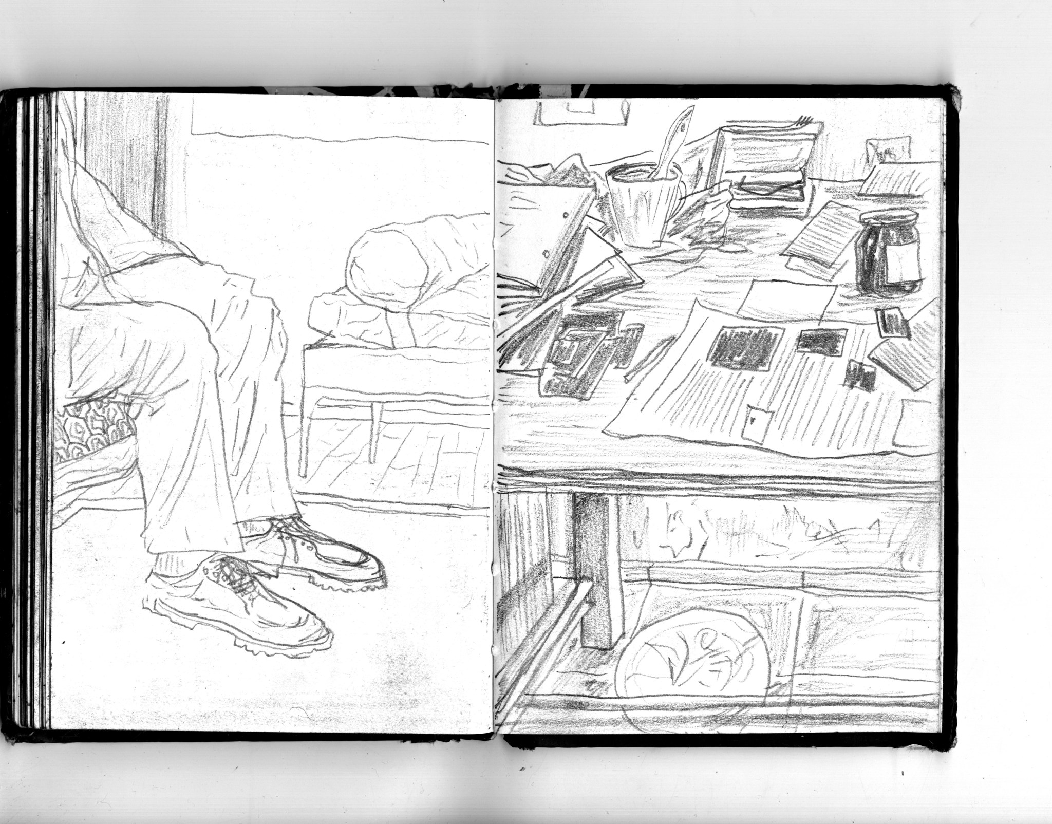 En janvier 2024 je décide de rendre viste à une amie à Londres. Alors que je suis arrivé depuis quelques heures, j’achète ce petit carnet A6 au Tate Modern Museum après avoir vu quelques expositions, dont une des peintures de Philipp Guston. Un soir j’ai manqué de peu de perdre ce carnet dans un bar de Piccadilly Circus. J’ai été le lendemain et heureusement, ils avaient bien gardé le carnet. Il m’avait fallu quand même un peu d’efforts pour retrouver l’enseigne du bar. Après ce week-end à Londres, j’ai décidé de pratiquer uniquement le dessin figuratif au crayon graphite jusqu’à remplir entièrement le carnet. De retour à Bruxelles je l’ai donc rempli pendant un mois à peu près partout où j’allais.