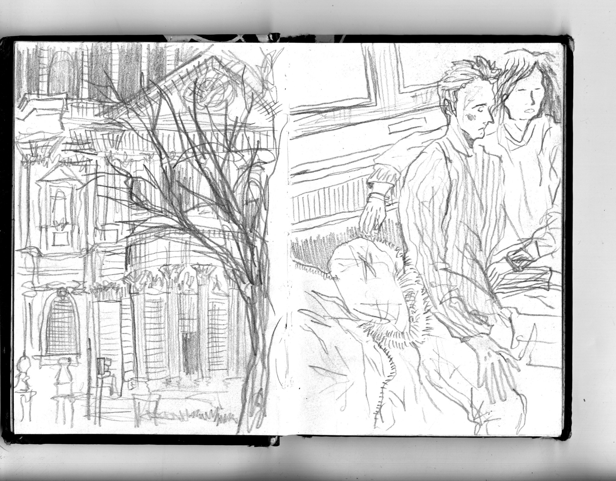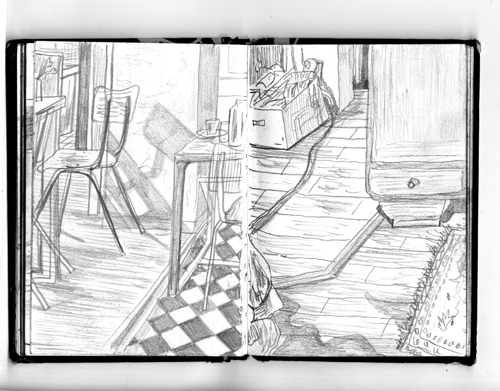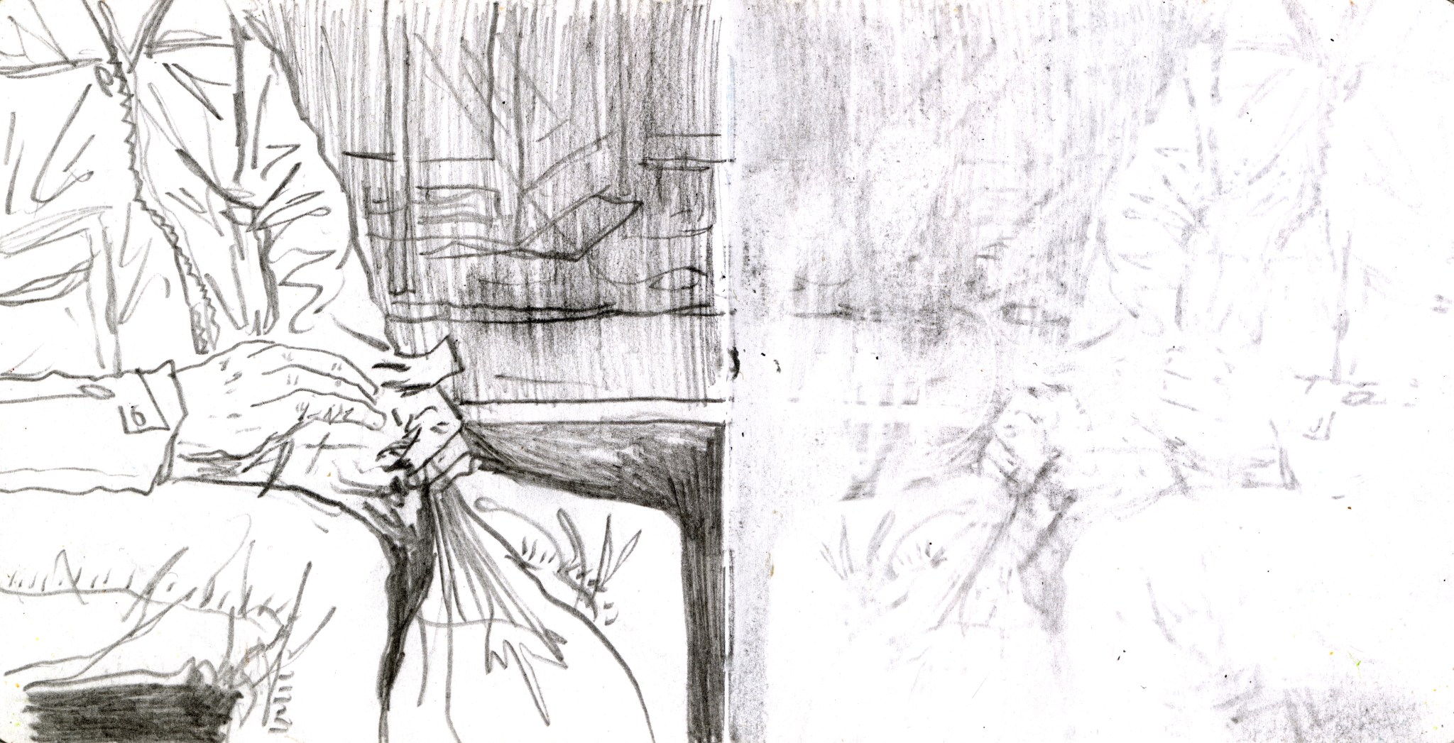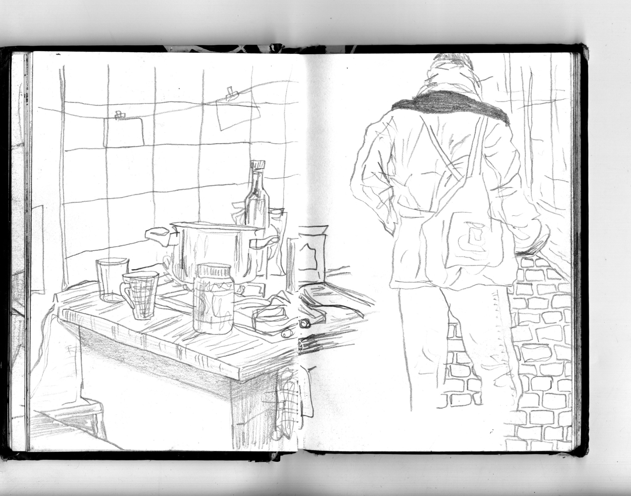 En janvier 2024 je décide de rendre viste à une amie à Londres. Alors que je suis arrivé depuis quelques heures, j’achète ce petit carnet A6 au Tate Modern Museum après avoir vu quelques expositions, dont une des peintures de Philipp Guston. Un soir j’ai manqué de peu de perdre ce carnet dans un bar de Piccadilly Circus. J’ai été le lendemain et heureusement, ils avaient bien gardé le carnet. Il m’avait fallu quand même un peu d’efforts pour retrouver l’enseigne du bar. Après ce week-end à Londres, j’ai décidé de pratiquer uniquement le dessin figuratif au crayon graphite jusqu’à remplir entièrement le carnet. De retour à Bruxelles je l’ai donc rempli pendant un mois à peu près partout où j’allais.
