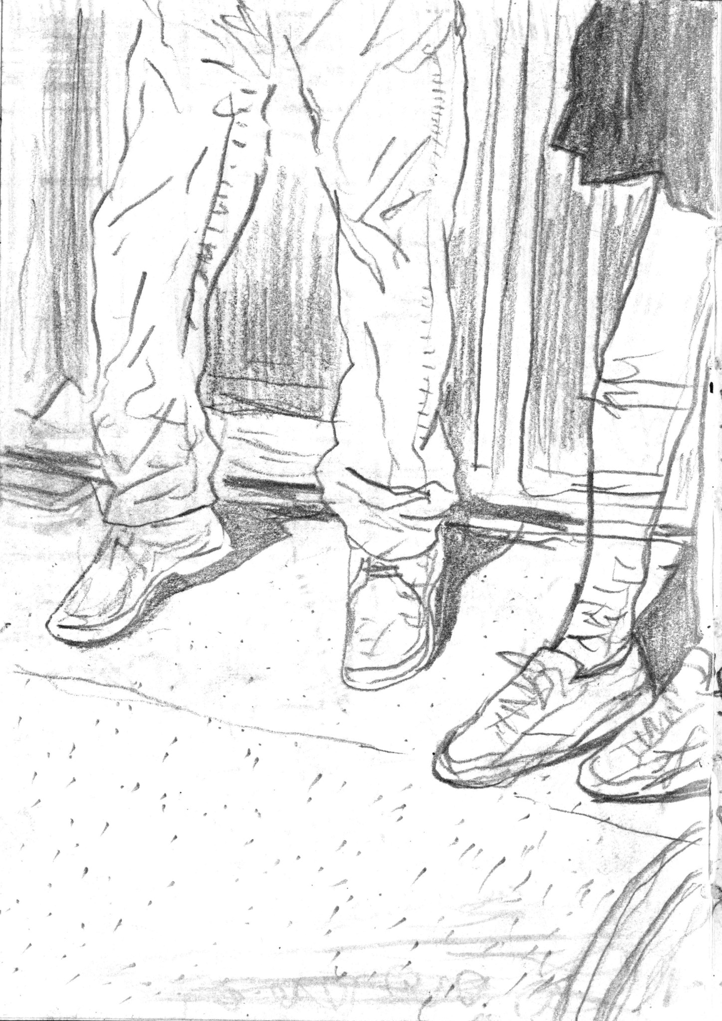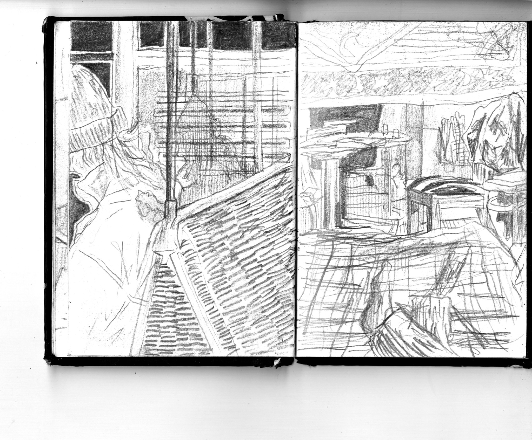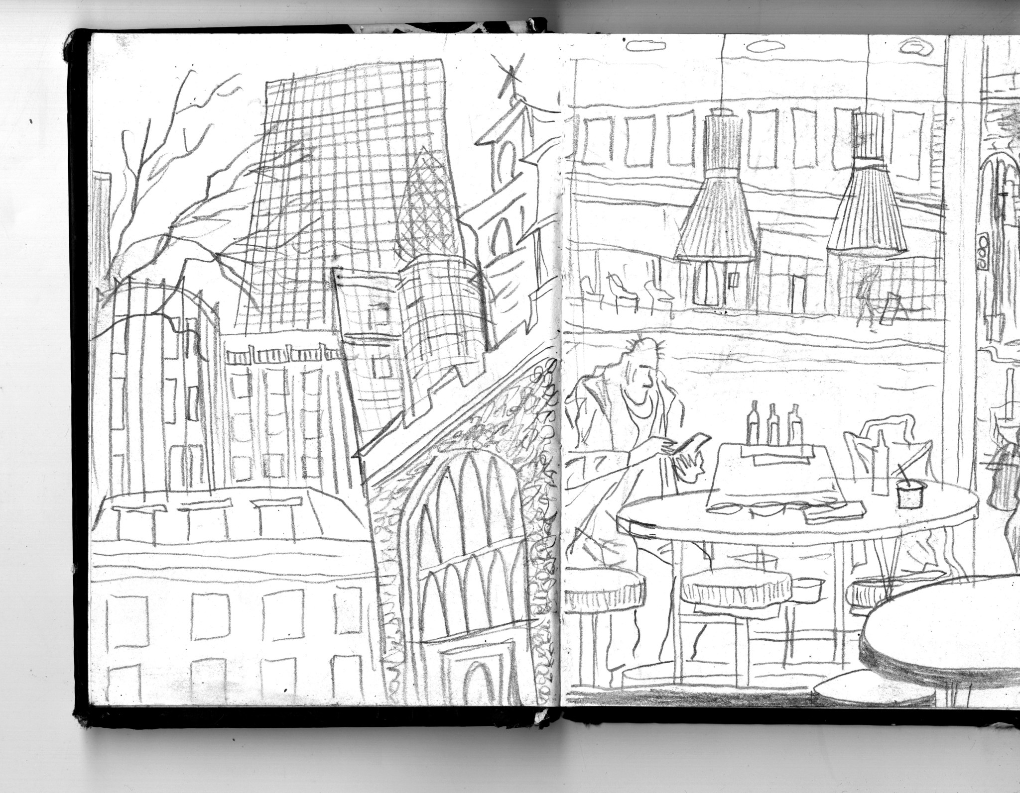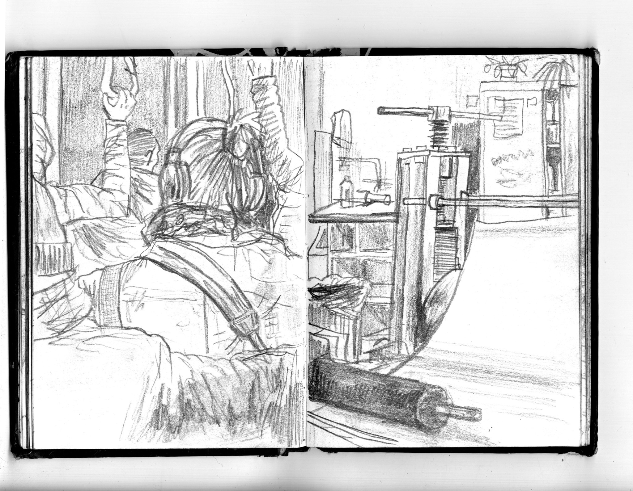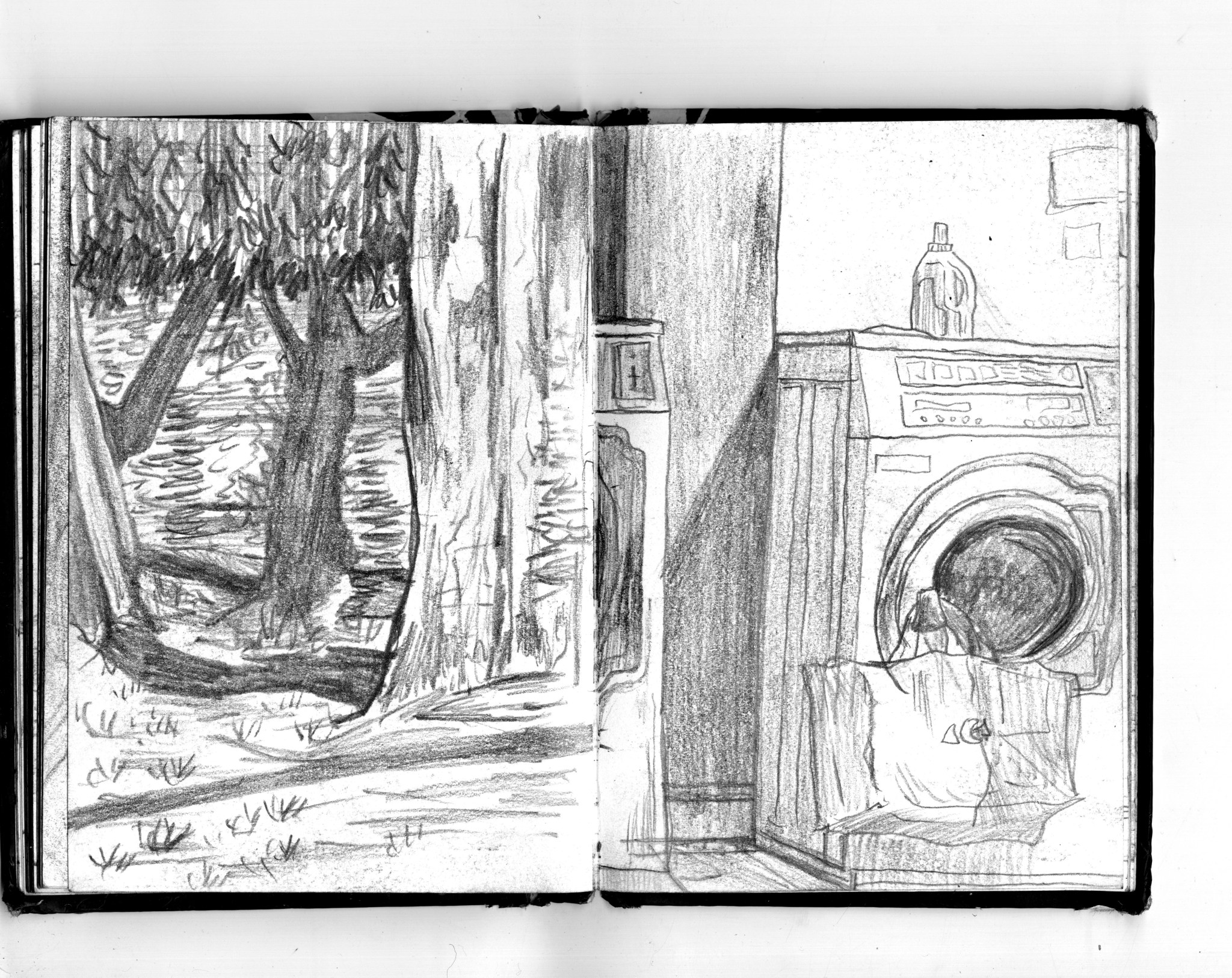 En janvier 2024 je décide de rendre viste à une amie à Londres. Alors que je suis arrivé depuis quelques heures, j’achète ce petit carnet A6 au Tate Modern Museum après avoir vu quelques expositions, dont une des peintures de Philipp Guston. Un soir j’ai manqué de peu de perdre ce carnet dans un bar de Piccadilly Circus. J’ai été le lendemain et heureusement, ils avaient bien gardé le carnet. Il m’avait fallu quand même un peu d’efforts pour retrouver l’enseigne du bar. Après ce week-end à Londres, j’ai décidé de pratiquer uniquement le dessin figuratif au crayon graphite jusqu’à remplir entièrement le carnet. De retour à Bruxelles je l’ai donc rempli pendant un mois à peu près partout où j’allais.